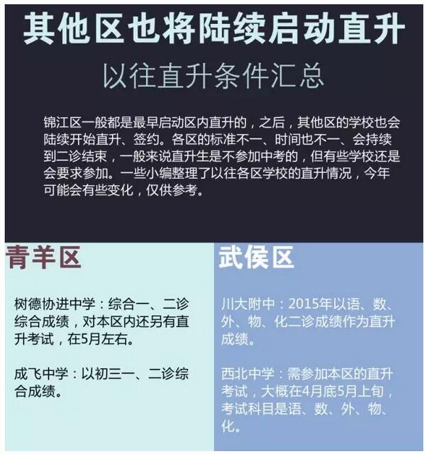 据家长消息,锦江区已启动2017年区内直升的招生工作,但是直升的标准有所变化。随着锦江区区内直升的启动,其他区也将陆续开始区内直升。2017年,区内的3中和17中已经启动了区内直升的招生工作!锦江区区内直升的要求较往年严格了,一定要“本地生”+“摇号生”才有资格,而且要分数达到学校划定的直升线才行!