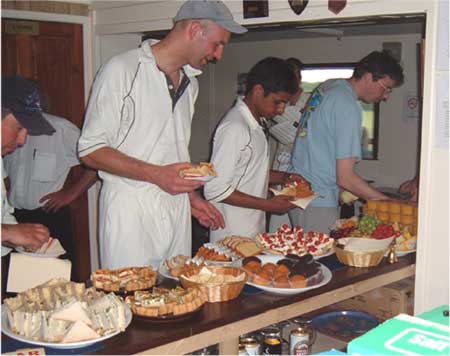 A note on tea, for non-cricketing friends at home and overseas. It is Very. Important. Team honour hangs on it. One of the first questions a new arrival at the game will ask - after 'what's the score?' will be 'what was tea like?' If 'shop cakes' is the answer, then there is a sad shaking of the head. Homemade is the watchword. Sandwiches should be fresh, and at least four varieties, nothing fancy - egg, ham, cheese, tuna. Mini pork pies and/or sausage rolls. Scones, of course, quiche if you're being posh, about three types of cakes (home baked, as we've ascertained, one should be fruitcake and lemon drizzle always goes down well), crisps, maybe some fancy biscuits, squash (always orange) and, because this is the most British of sports, played in summer, a huge urn of hot tea. Andy had just got to the bottom of a well laden plate of food, when his team captain wandered over and asked if he'd open the batting. He had ten minutes to digest it all before his energetic stint on the frontline...