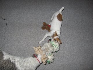 Wow...after a couple of days we are fast friends. We play together and wrestle all the time. We both sleep on the parental bed until Elizabeth comes home, then Tika switches to sleep with her. We go for walks, though she is not nearly as well behaved as I am. We fight over who gots the best chew stick. We wrestle for my favorite tug toy. We play tug with her stuffed animals. (Score = Terriers 3 Animals 0) We share water dishes. She tries to eat my food. I try to get more treats than she does. I have my muzzer convinced that Tika is eating my food, so muzzer slips me treats from my private stash.