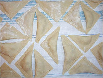 Ritagliare dei quadrati di circa 8cm di lato e suddividere su ognuno un po' del ripieno. Piegare a triangolo e premere bene sui bordi.