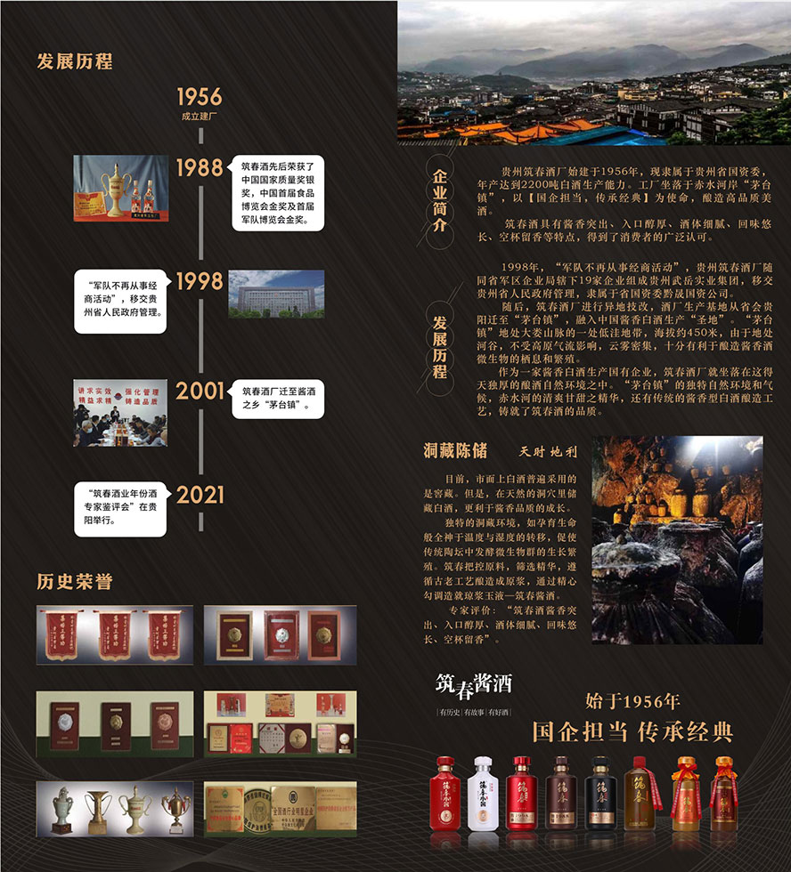 贵州筑春酒厂始建于1956年,现隶属于贵州省国资委,年产达到2200吨白酒生产能力。工厂坐落于赤水河岸“茅台镇”,以【国企担当,传承经典】为使命,酿造高品质美酒。