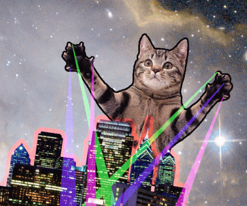 Кот в образе Годзиллы управляет разноцветными прожекторами.
