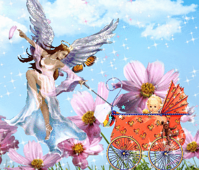 Ангел в женском образе спустился с небес, чтобы покачать коляску с младенцем. Отличная анимационная открытка, чтобы поздравить друга с днем рождения.