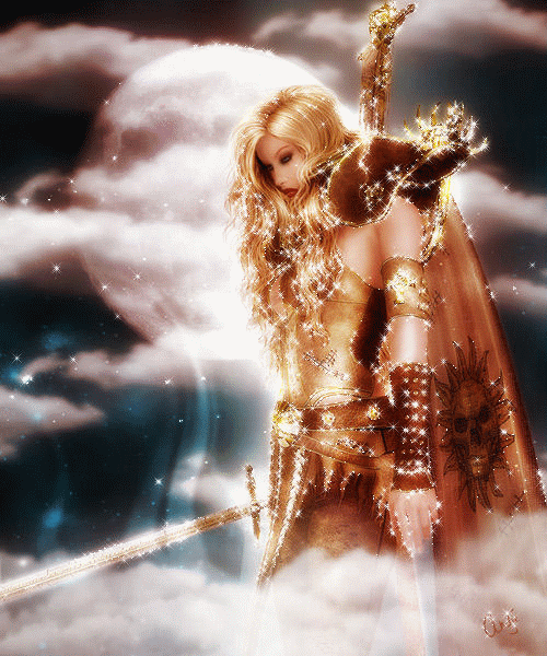 Воинственная амазонка с огромным мечом в руке, её развевающийся черный плащ говорит о серьезных намерениях.