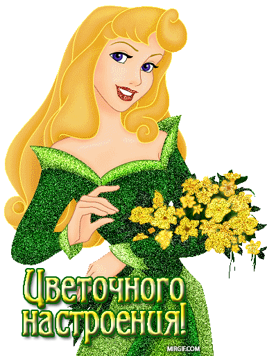 Цветочного настроения желает всем прекрасная принцесса Аврора в изумрудно-зеленом платье с нарядным букетом солнечно-желтых цветов.
