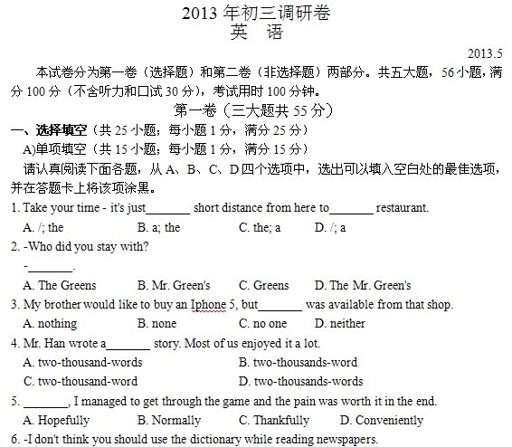 您现在的位置:中考苏州站 > 中考备考 > 中考二模 > 英语二模 > 正文