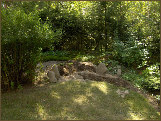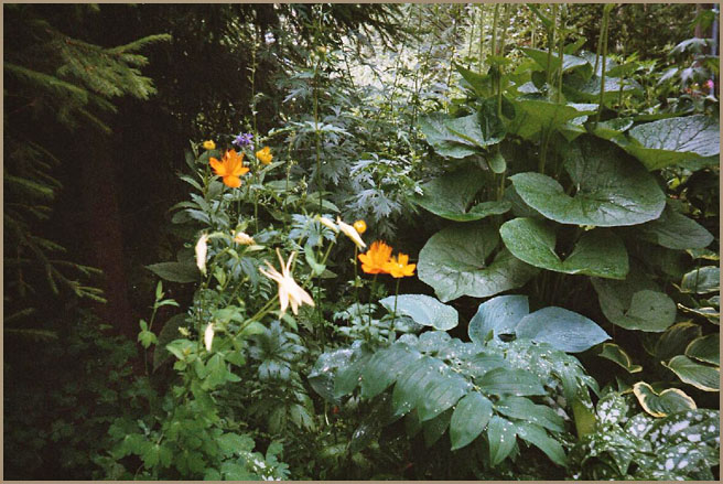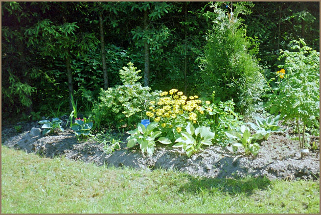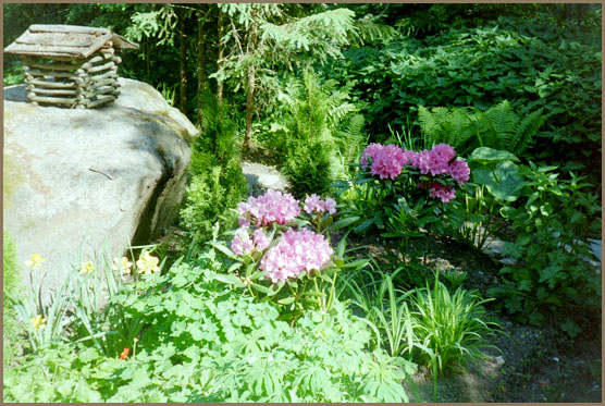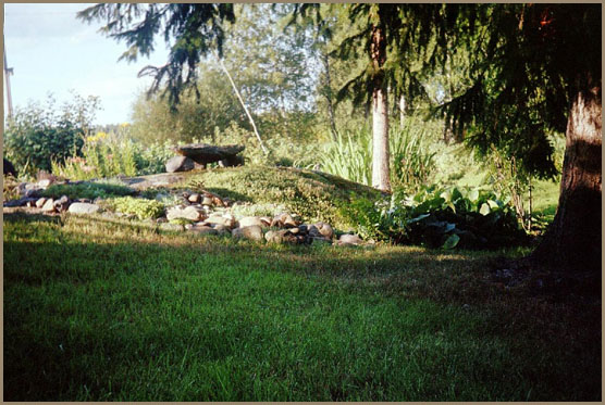 Suuren pihakuusemme alla on japanilaistyyppistä kivikkotarhaa, missä kasvaa vuorenkilpiä, erilaisia maksaruohoja, rikkoja, neilikoita ja kissankäpäliä.