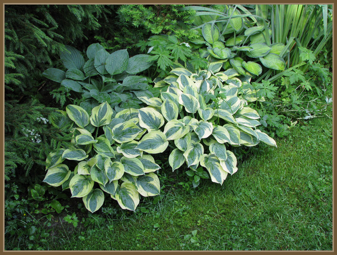 'Princess Irene'. Taustalla kasvaa ukonhattua, nauhuksia, kuunliljoja ja lehtosinilatvoja.