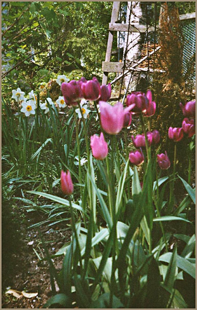 Koiratarhan vieressä kasvaa hiekkaisessa luiskassa 'Negritta' ja 'China Pink'-tulppaaneja. Hollannintuonti tuijat kuolivat talven aikana, kun niiden suurimmat juuret oli purkituksen yhteydessä katkaistu.