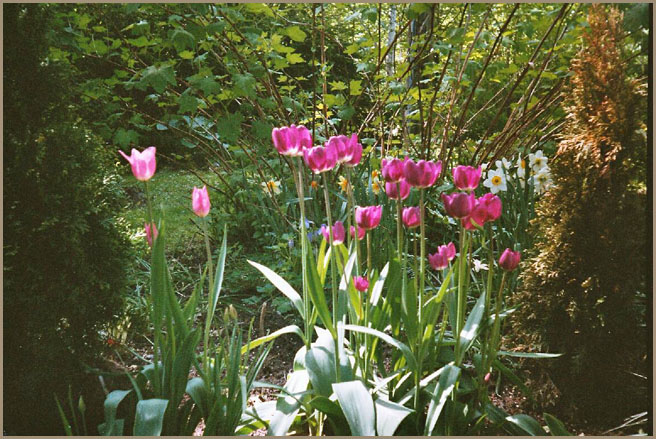 Tulppaaneista Apeldoornit ovat viihtyneet savisessa maassa ja säilyvät monivuotisina. Niillä kasvaa runsaasti hopeapajun alla kotkansiipisaniaisten lomassa.