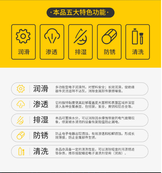 多功能電器、電子防水、防潮、防銹、潤滑劑,能防止因水浸、潮濕、銹蝕所造成的電器、電子儀器鼓掌,能及時搶救受水浸的電機,預防電器故障。