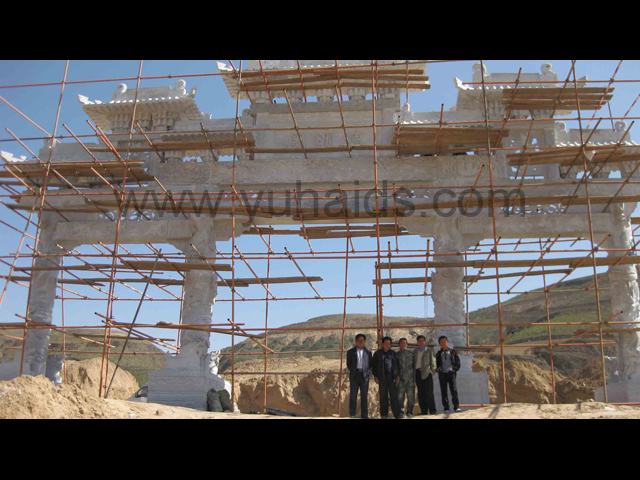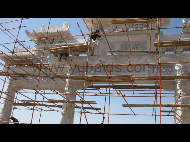这是南京德明园大理石石雕牌坊应用案例。整个牌坊以大理石雕刻制作而成,主要以龙纹作为装饰图案,包括柱体和牌坊其他部件,大都可以看到龙的形态。